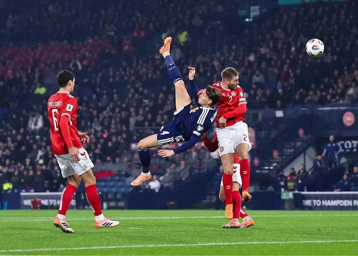 صحنه گل مک‌تامینای مقابل دانمارک از همان لحظه اول، تبدیل به بحث روز فوتبال جهان شد. بدن کاملاً کشیده ستاره اسکاتلند و مدافعانی که تنها نظاره‌گر این جهش تاریخی هستند، یک قاب سینمایی ساخته است. آنچه این لحظه را خاص‌تر می‌کند، هماهنگی بی‌نقص بدن اوست؛ پرشی عمودی که در نهایت به ارتفاع ۸ فوت و ۳ اینچ رسیده و ضربه‌ای که نه فقط زیبا بلکه تاریخی است. بدون اغراق می‌توان گفت که در زمان شلیک قیچی برگردان این بیشینه توان بدن انسان است.